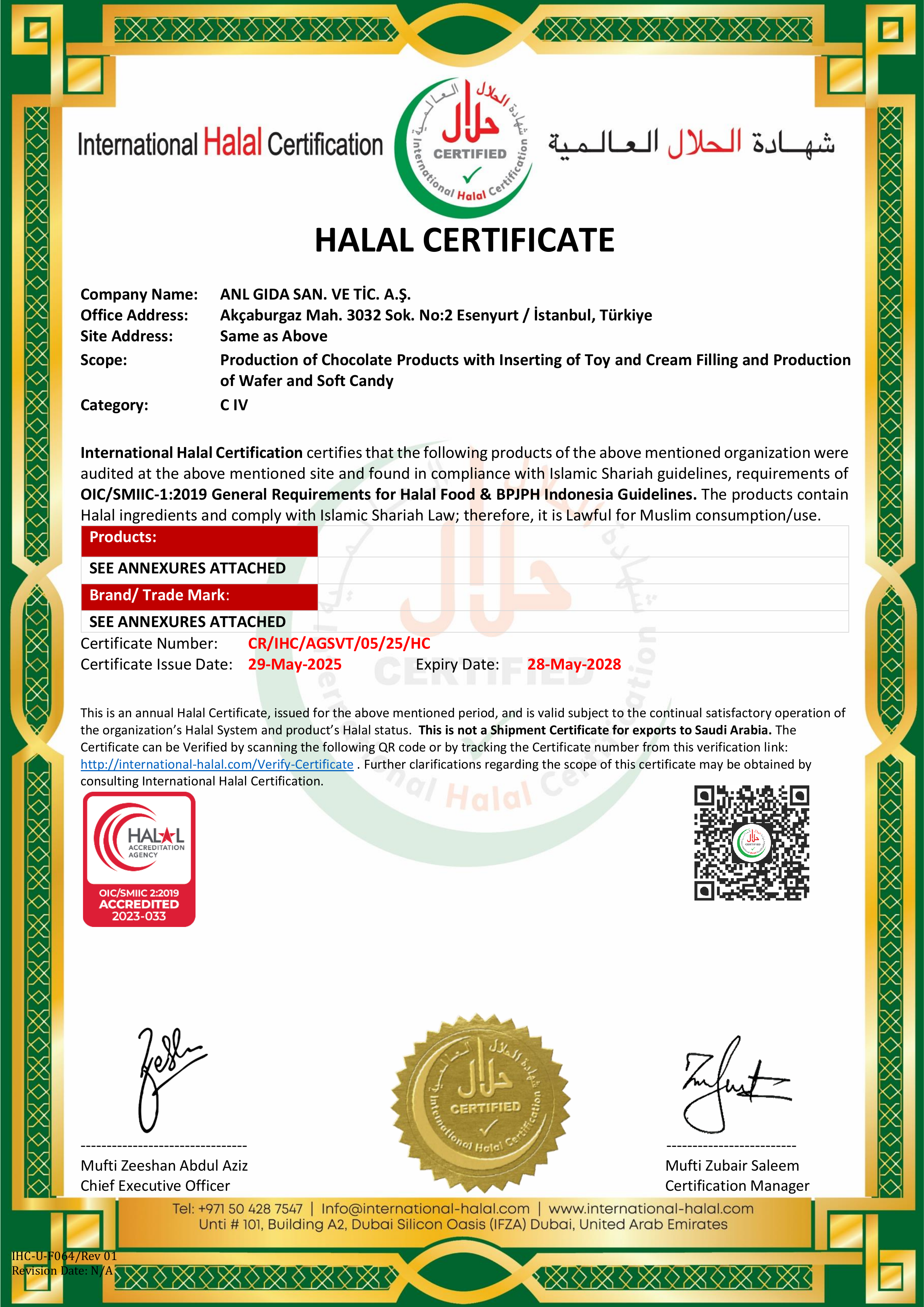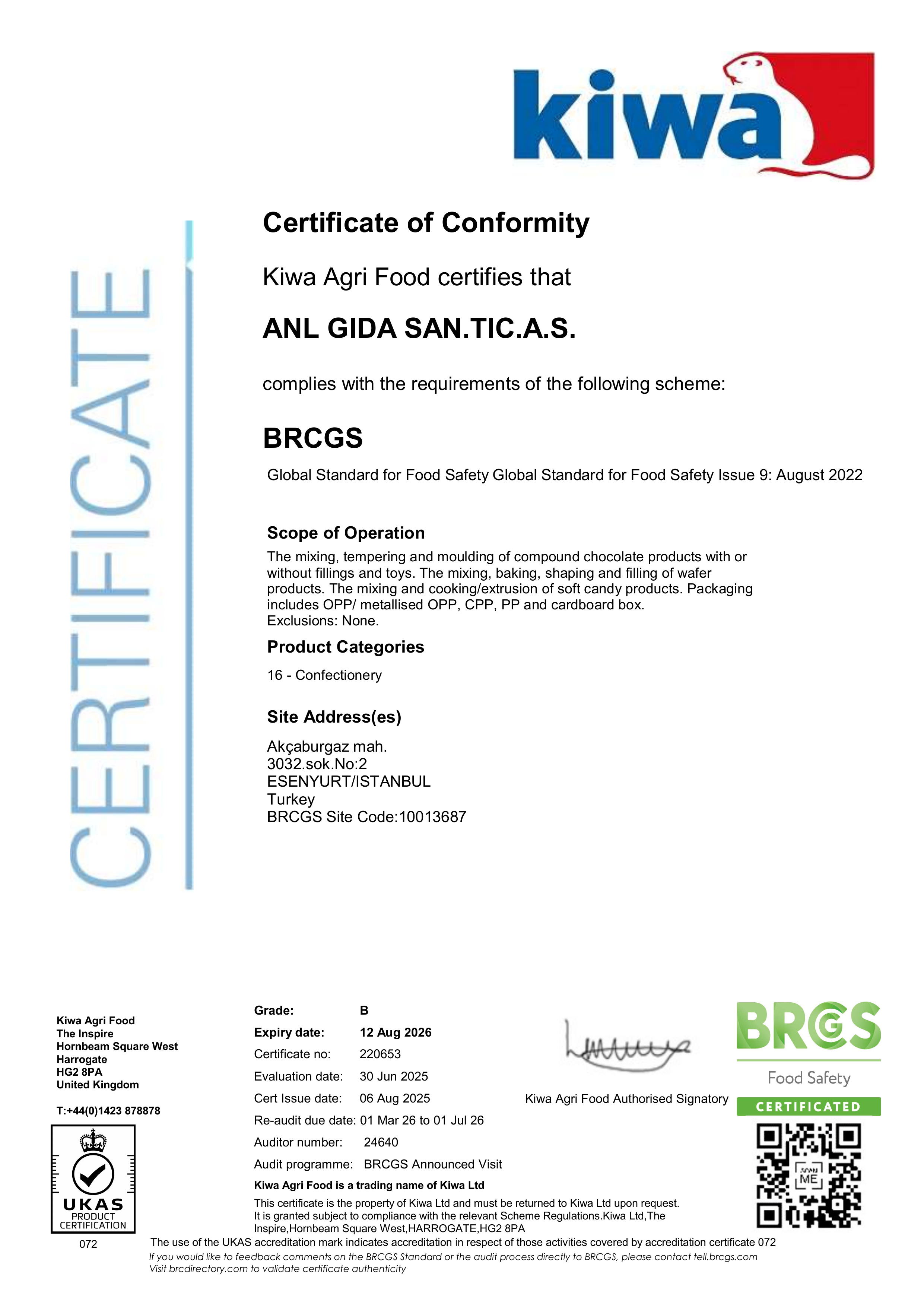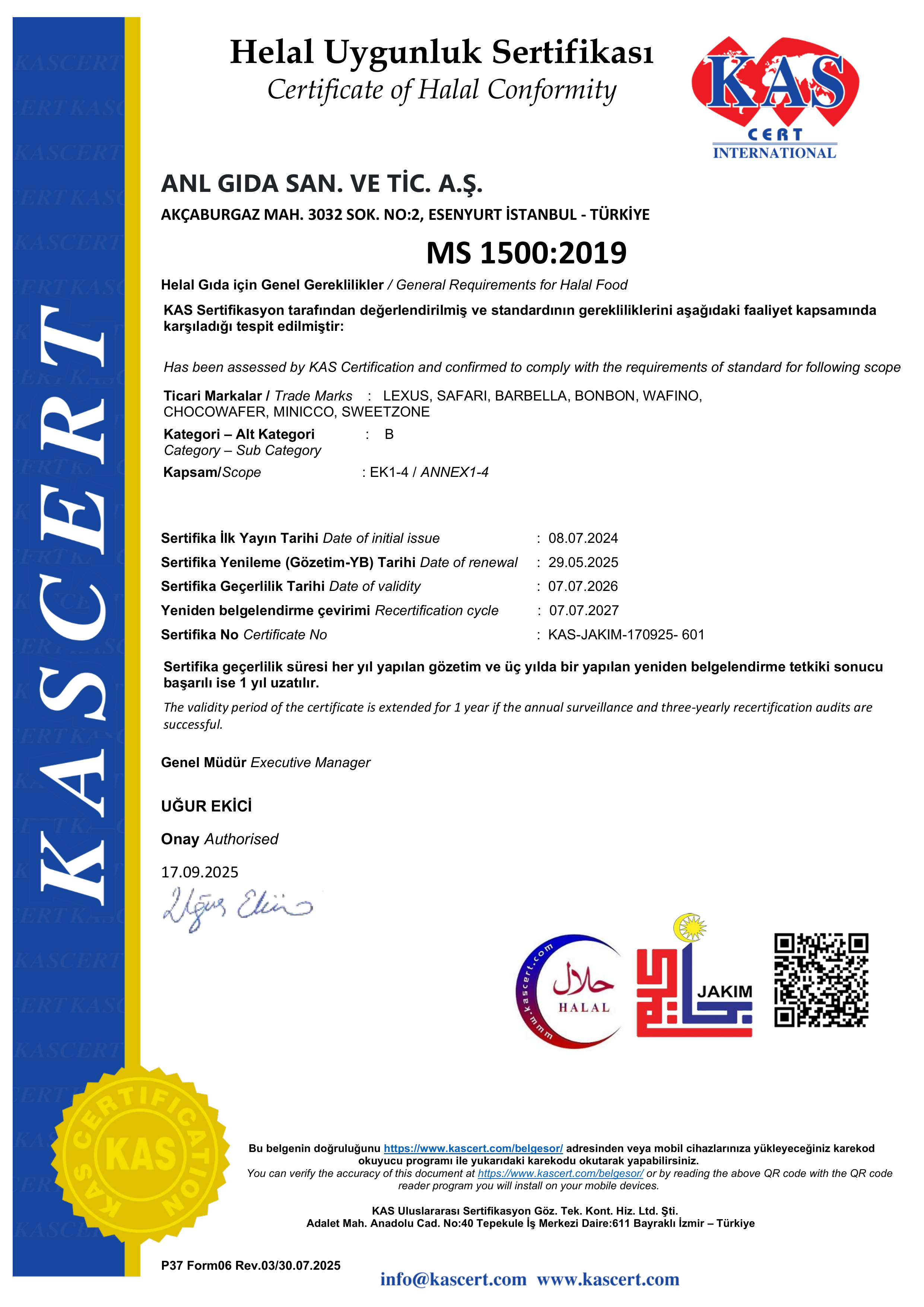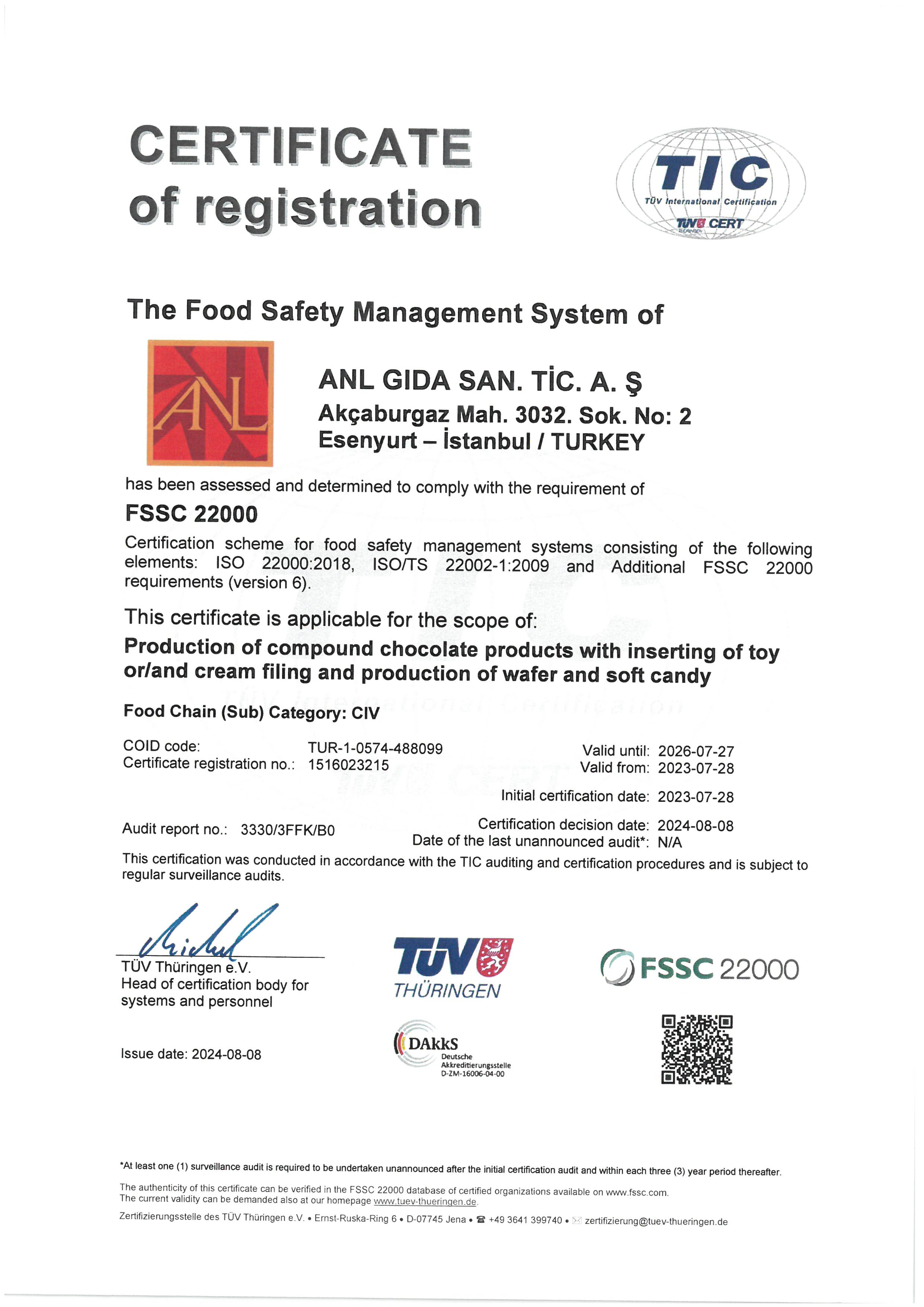ANL Food Inc. Co., established in 2005, has an important role in chocolate products industry, producing chocolate surprise eggs with toys, surprise eggs with cream and toys, cornets and mini cones, figure chocolates for kids; chocolate coated mini wafers, cream filled chocolates for both adults and kids at its integrated plants in Istanbul. ANL Food Company invested in a new modern facility for licorice production and continues producing chocolate and licorice products on 50.000 m2 closed area in Esenyurt and Avcılar. ANL Food Company produces its products under the umbrella brands Chovo Wafer, Lexus, Minicco, Wafino and exports to more than 80 countries. Production is carried out in accordance with international standards in both facilities. In addition to the general packaging types, chocolate products that are presented in Christmas, Easter, Valentine’s Day and timeless gift packages are appreciated.